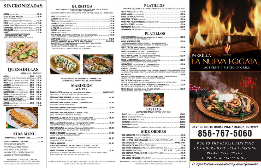 Introducing the menu at Parrilla La Nueva Fogata, a Mexican food haven located in Berlin, NJ. This Latinx-owned restaurant offers a wide array of options for vegetarians and meat-lovers alike. Their menu showcases authentic Mexican flavors like chorizo queso appetizers, mushroom quesadillas, shrimp and fish tacos, and Al Pastor tacos with cheese, onion, cilantro, and pineapple. Standout dishes include their chicken Tinga quesadilla and flavorful nachos topped with refried pinto beans and cotija cheese. Customers rave about the generous portions, efficient service, and consistently delicious food. While the restaurant may lack in ambiance, the focus on quality ingredients and traditional recipes truly shines through in every bite. Don't miss out on this hidden gem for a taste of Mexico in New Jersey.
